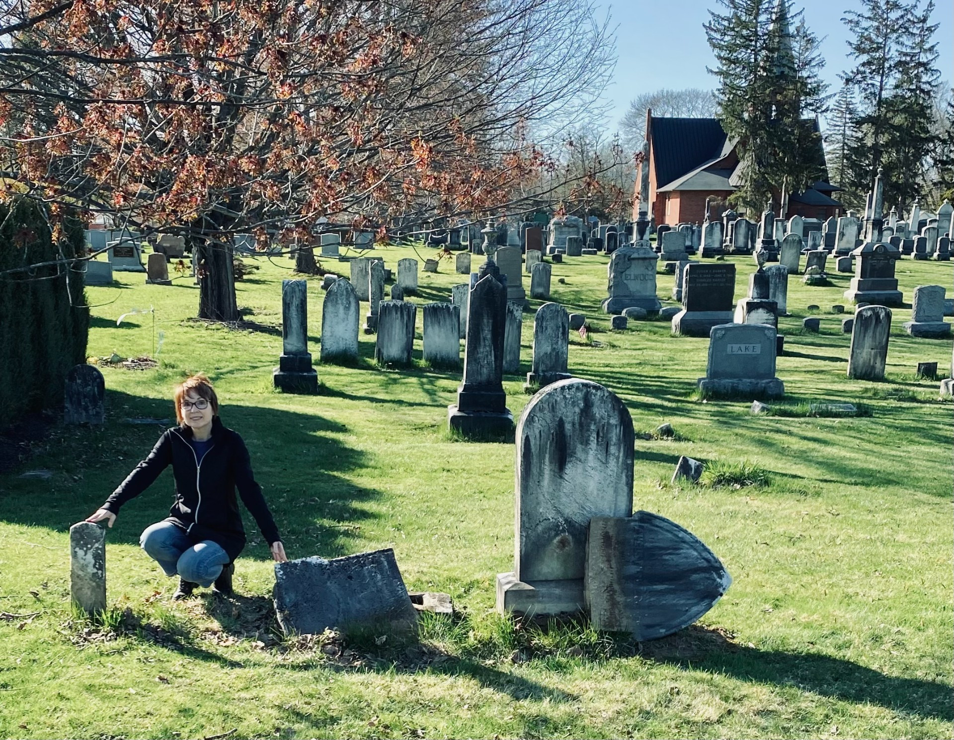 Source: Bonnie Wood touches Madame Anna Bishop Schultz’s sunken unmarked gravestone on far left and Anna’s son Augustus Bishop’s broken gravestone at St. Paul’s Lutheran Church in Red Hook, NY. The other portion of the broken stone leans against Richard Barringer’s intact gravestone, Photographer: Alice Clarke Benson, April 20, 2022.