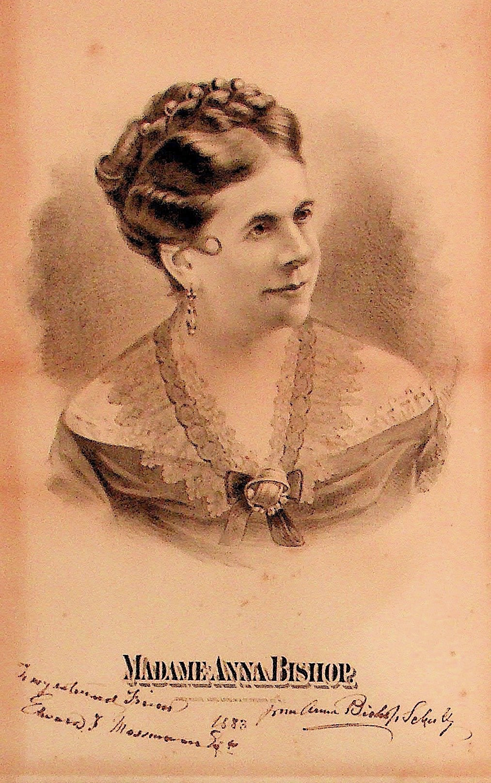 Source: Madame Anna Bishop print inscribed “To my esteemed Friend Edward F. Massonneau Sr. from Anna Bishop Schultz”, displayed on the living room wall at the Trail’s End residence of Martin Schultz’s niece Emma Schultz Tipple Coon until 1986, Courtesy: Bonnie Wood Trail’s End Collection Milan NY.